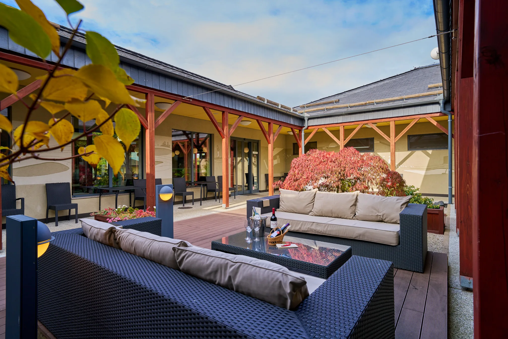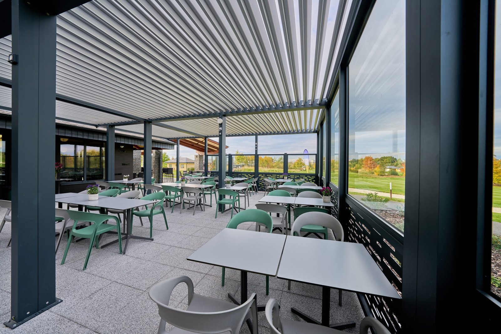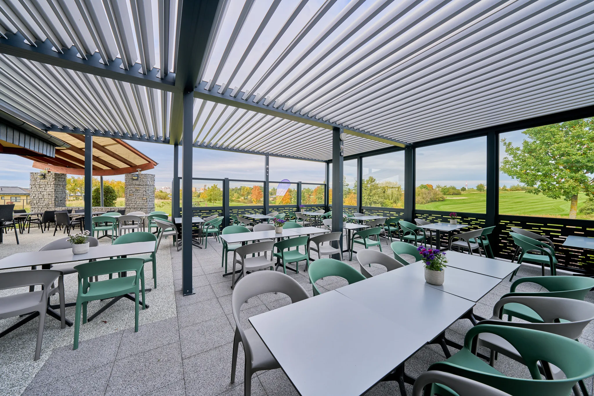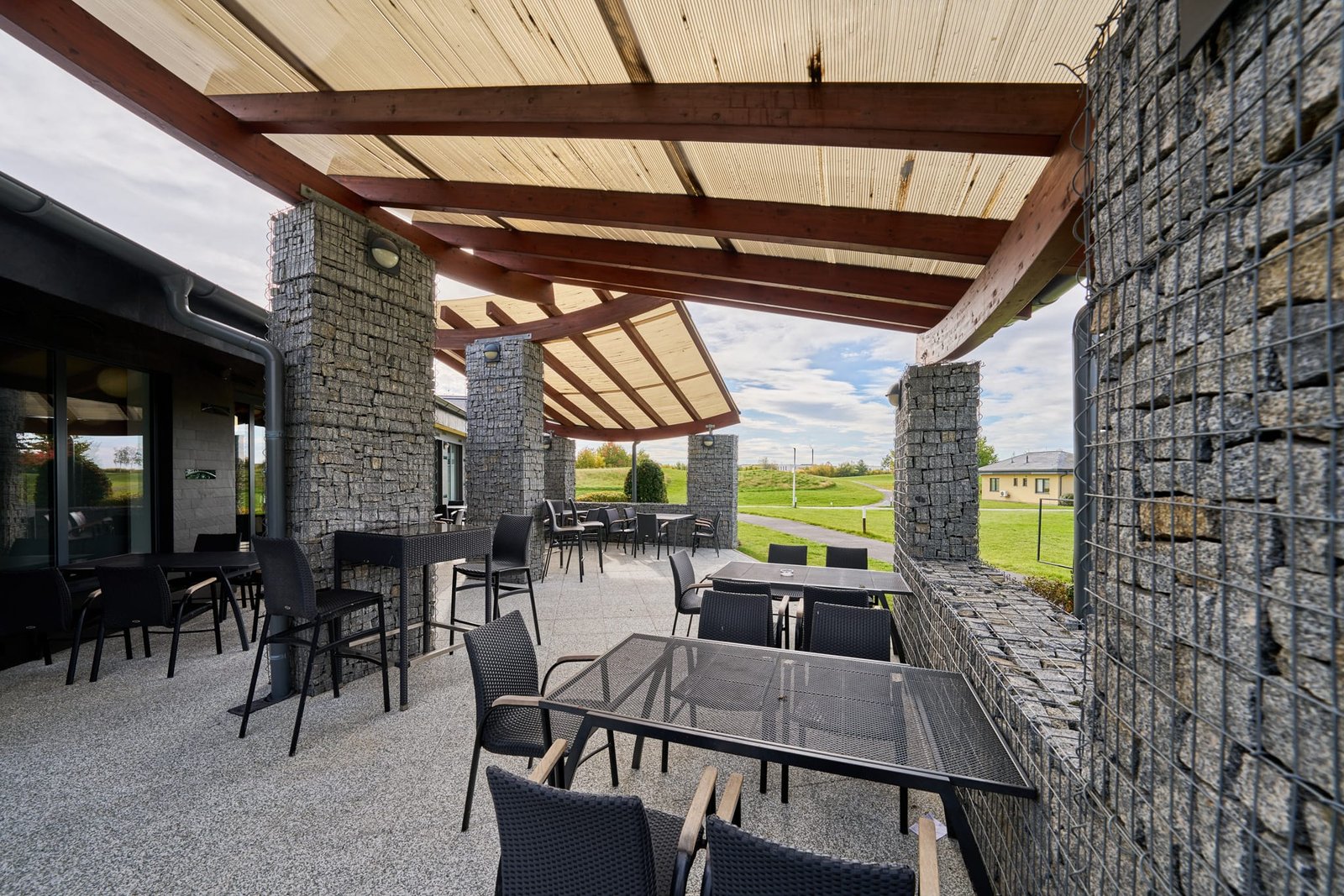 Stylová, vyhřívaná terasa s výhledem na golfové hřiště, využitelná celoročně.
